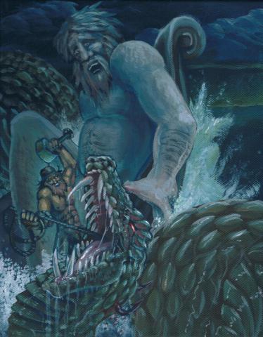 Der Riese Hymir besitzt einen unsagbar großen Kessel, daß selbst der riesige Thor, als er diesen über sein Haupt stülpt, um ihn davonzutragen, nur noch mit den Füßen zu sehen ist. Es ist die Geschichte, in der Hymir zuvor zusammen mit Thor in See sticht um zu fischen. Was dann geschieht, läßt Hymir die Farbe wechseln. Thor hingegen ist unerschrocken wie immer. Aber hört selbst, im Hörbuch 16 wird die Geschichte näher erläutert.