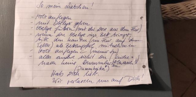 Nachfolgend ein weiteres Beispiel, welches belegt, daß das Geschriebene Einfluß auf die Handschrift nimmt. Ein Brief einer Mutter an ihre jugendliche Tochter, ein Aufgabenzettel sozusagen.