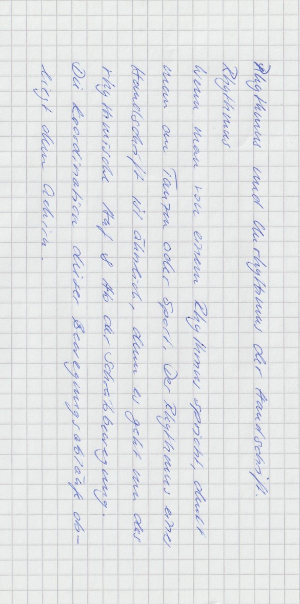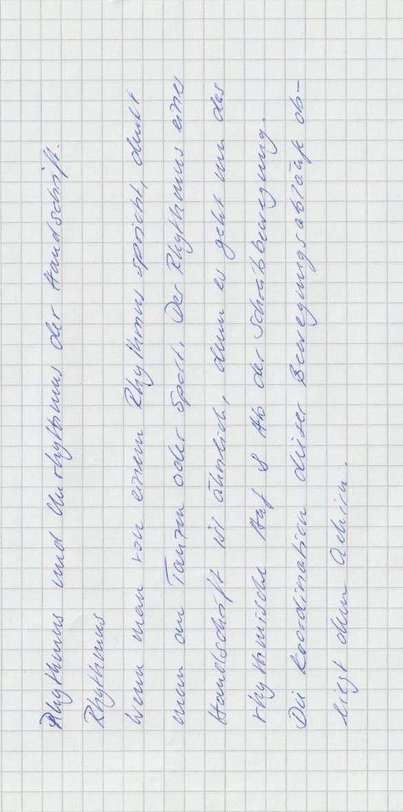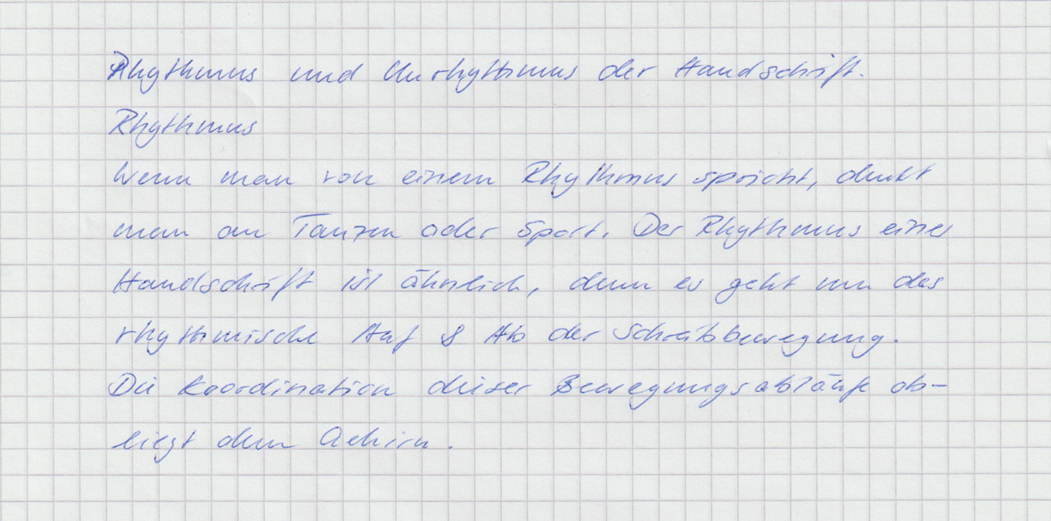 Wenn man von einem Rhythmus spricht, denkt man an Tanzen oder Sport. Der Rhythmus in einer Handschrift ist ähnlich, denn es geht um das rhythmische Auf und Ab der Schreibbewegung. Die Koordination dieser Bewegungsabläufe obliegt dem Gehirn.