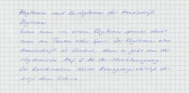 Je rhythmischer eine Schrift, desto stabiler und zuverlässiger der Charakter des Schreibers. Je flexibler eine Schrift wird, desto mehr kann der Schreiber sich an neue Situationen anpassen. Ein dynamischer Mensch zeigt dies im Schreibstil, der Charakterstruktur wie auch dem Denkprozeß. Jeder Unrhythmus in einer Handschrift zeigt auf, daß sich das Gruppenverhalten unter Streß verändern kann.
