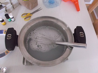 Anschließend eine Stunde stehenlassen, danach mit weiteren 700 ml Wasser aufgießen und aufkochen. Mit dem Schneebesen verrühren und ätherisches Öl dazugeben.