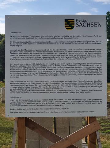 Der Brunnen wurde ca. 1772 erbaut. Der Architekt soll Carl Friedrich Schäfer gewesen sein, der damals Hofbildhauer des sächsischen Kurfürsten Friedrich August III. war. Der Brunnen war seiner Zeit einer der größten barocken Brunnenanlagen in Sachsen. Ein muschelähnliches Bassin wird von einem Felsmassiv geziert, auf welchem Venus mit Schwänen lagert. Auch Aphrodite, die Schaumgeborene, reist in einem Wagen, der von Schwänen durch die Lüfte gezogen wird.