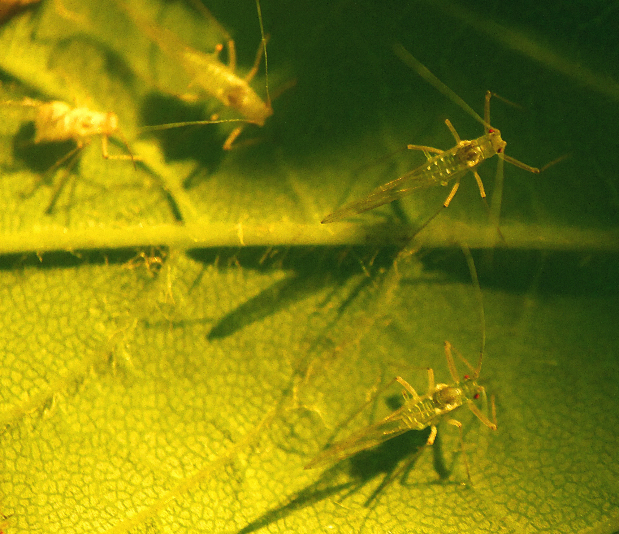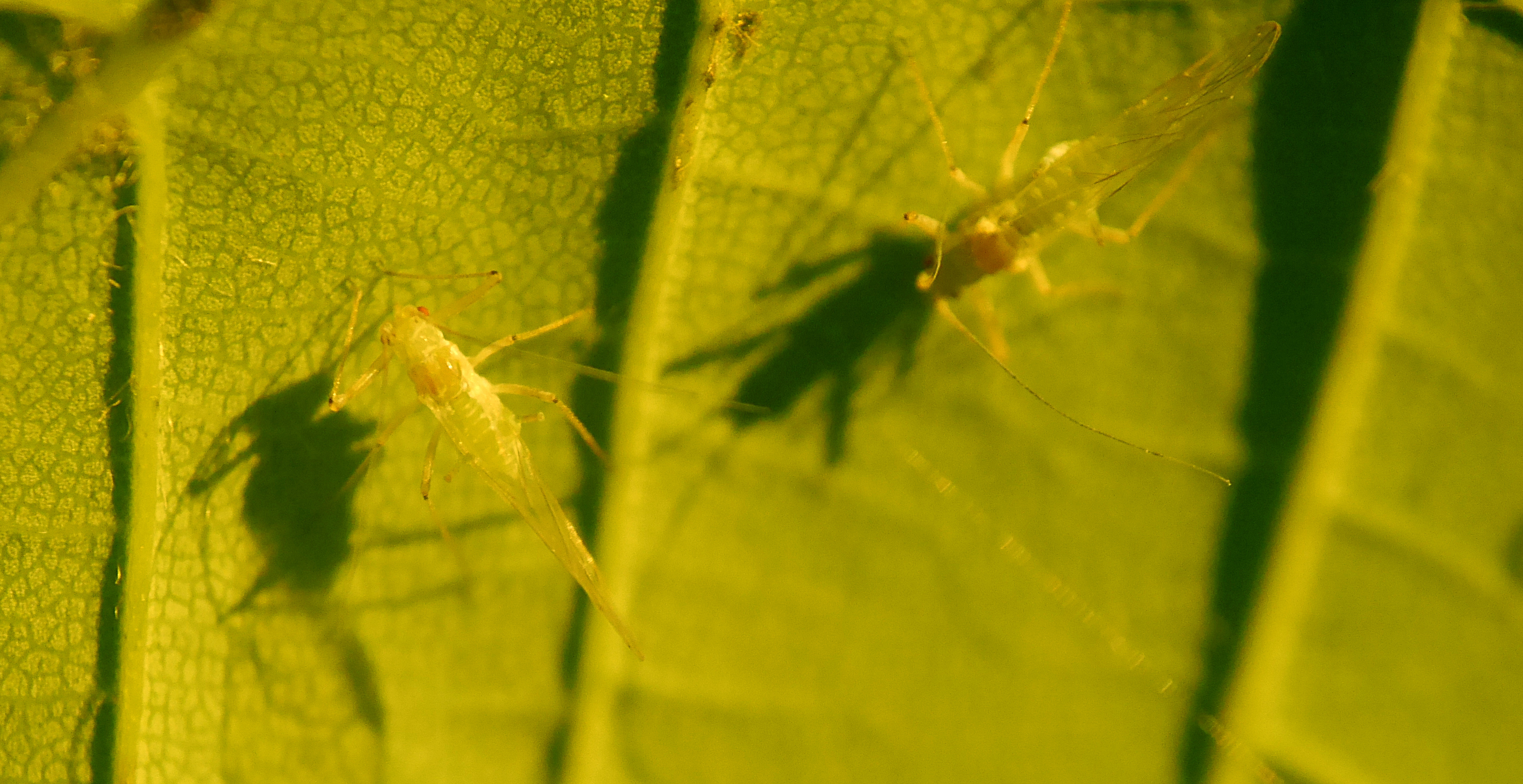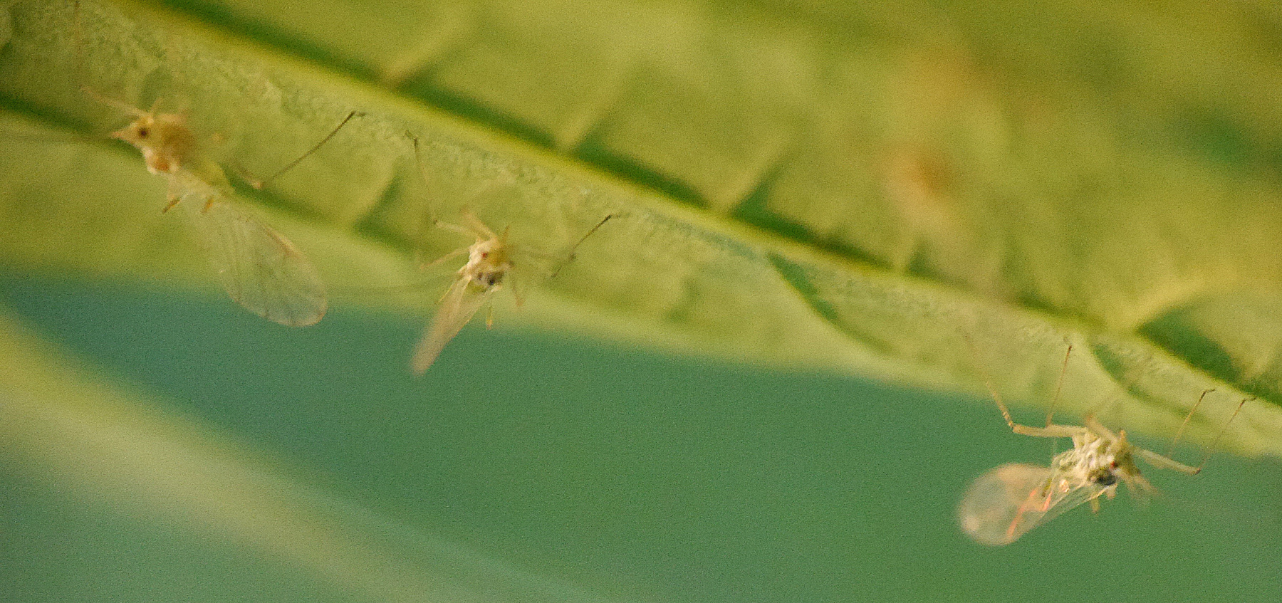 Zitat:Ich finde, das sind ja ungewöhnliche Blattläuse. Mit etwas, was aussieht wie ein Schwänzchen hintendran. Und Blattläuse verteilen sich doch sonst gar nicht so regelmäßig, sondern bilden doch so Pulks. Und sie sitzen an den Stengeln und Blattadern, nicht so sehr im Blatt. Mir kommen sie auch ganz schön groß vor, größer als die "üblichen" Blattläuse.