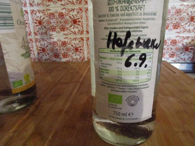 Frisch angesetztes Hefewasser mit halbierten Datteln. Ich mache mir selten die Mühe, die alten Etiketten zu entfernen. Gehen sie nicht irgendwann von selber ab, benutze ich sie einfach zum draufschreiben, was jetzt drin ist.