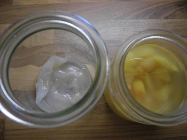 8. Umfüllen nach zwei bis vier Wochen. Hier variiert die Dauer bei jedem Essig. Bereit zum Umfüllen ist der Essig, wenn die Früchte nach unten gesunken sind, der Geruch intensiv ist und sich womöglich eine Essigmutter gebildet hat. Bei mir hat sich eine Essigmutter gebildet.