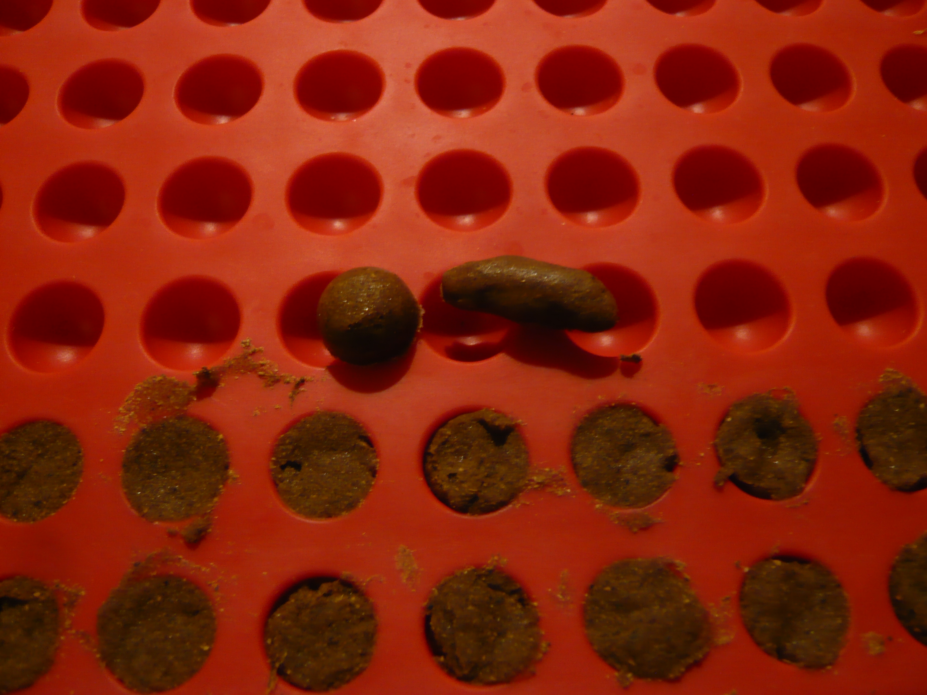Alternativ habe ich den Teig auch in Bonbon-Formen gegeben und auch dann vor dem Schlucken wieder länglich gedreht. (Die 5 g Haritakipulver ergaben mit dem Konjakpulver 26 dieser Bonbons/Teiglinge).