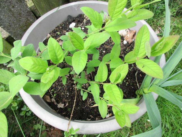 Auch Beerenobst ist gut zu haben. Denn auch die wachsen einfach von allein und bringen jedes Jahr aufs Neue Früchte, ohne daß man noch viel dazu tun müßte. Dies ist eine sibirische Blaubeere, mit dem schönen Namen Eisbär. Auch davon habe ich zwei Pflanzen. Viele Bäume und Sträucher sind schon selbstbefruchtend, aber es ist dennoch von Vorteil, wenn sie sich gegenseitig befruchten können.