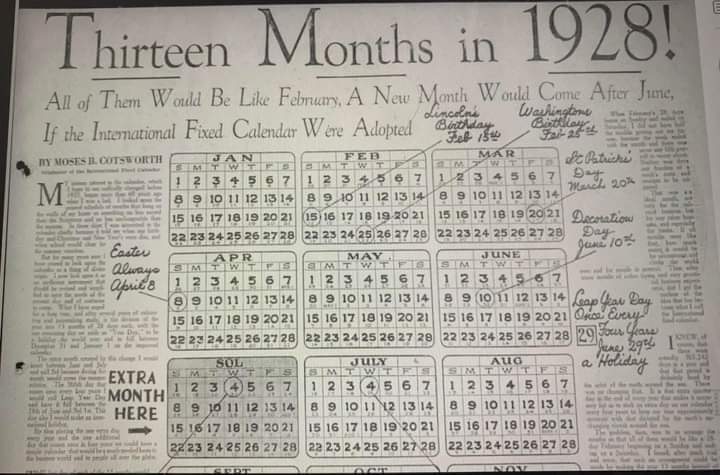 Zitat:Können Sie sich vorstellen, zwischen Juni und Juli einen zusätzlichen Monat zu haben?! Im “International Fixed Calendar,” wurde genau das in den 1920er Jahren vorgeschlagen. Die einzige Organisation, die diesen 28-Tage-Monats-Kalender übernahm, war Kodak, die ihn bis 1989 durchhielt.